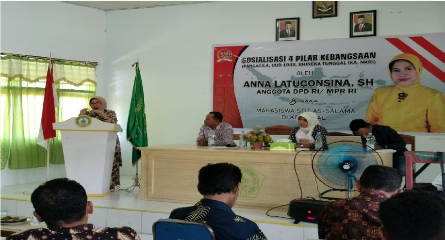 MALUKU – 21 Februari 2023, Anggota DPD RI/MPR RI Anna Latuconsina menyelenggarakan sosiaslisasi 4 pilar kebangsaan di STIT As-Salama Kota Tual, Kabupaten Maluku Tenggara, Provinsi Maluku. Sebagai anggota MPR, Anna Latuconsina memiliki tugas untuk memasyarakatkan 4 pilar kebangsaan, yakni Pancasila, Undang-Undang Dasar tahun 1945, Negara Kesatuan Republik Indonesia (NKRI), dan Bhineka Tunggal Ika.